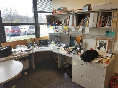Side note. I do get hassled about my messy desk. Below is a wide shot of what it looks like right now. Below, on and above my desk is full of stuff. There is that saying about a messy desk and a messy mind. Totally get that. So what does that mean if you have an empty desk?