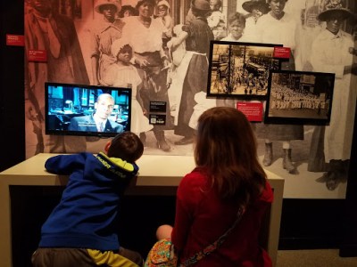 Our first stop was at the history museum. I really liked how the exhibits are easy to engage with at various levels. The kids are watching a video about a historic home ownership case that started in St. Louis. If you didn’t want to watch the video you could have read one of two posters. One was for kids, pretty much summed up what you were looking at in two sentences. The other poster was larger but still easy to read within a minute.