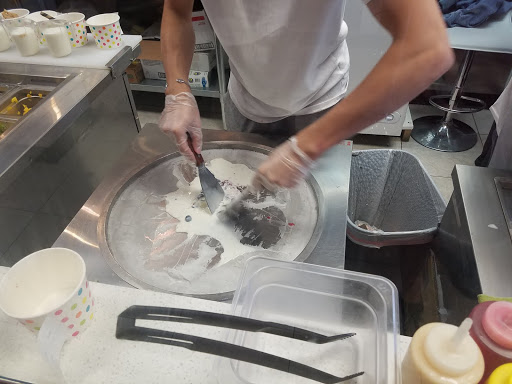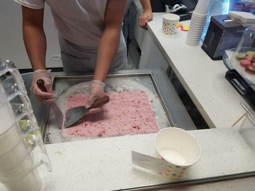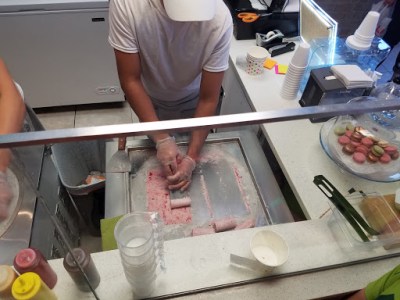 We stopped by the new Korean ice cream place. It was the most interesting thing I have seen in some time. They pour the liquid onto what looks like a super chilled pizza plate. Then they start working it.